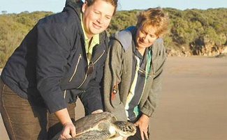 Early Friday morning the pair released a green turtle back into the wild at Workman's Beach, Agnes Water, after nursing the sick marine turtle back to health.